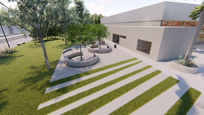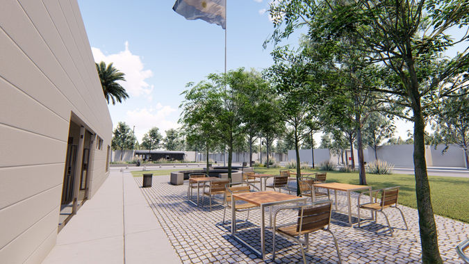 The main entrance is framed by a lightweight metal canopy, providing both protection and a contemporary character. Inside, the grand auditorium hall serves as the core of the project, accommodating a variety of events, from conferences to exhibitions. Complementing this functionality, outdoor recreation areas, a café, and a bar have been incorporated, fostering social interaction and relaxation.