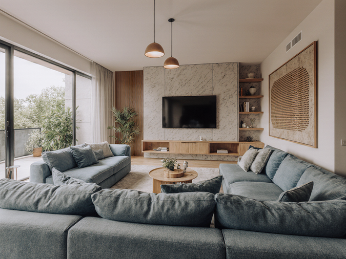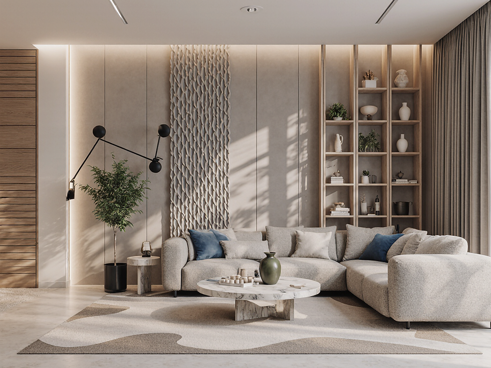 A stylish living room is defined by thoughtful furniture choices that balance elegance and comfort. Natural light enhances every texture and material, creating a warm and inviting atmosphere. The design maximizes exterior views, seamlessly connecting the interior with its surroundings and elevating the overall living experience.
